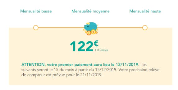 On vous propose par défaut la « mensualité moyenne », qui nous semble la plus ajustée. Si vos prévisions météo sont différentes des nôtres, vous pouvez faire glisser la tirelire vers la mensualité basse ou la mensualité haute. Dans tous les cas vous pourrez nous communiquer le relevé de votre compteur tout au long de l’année ce qui permettra de réajuster si besoin votre mensualité.